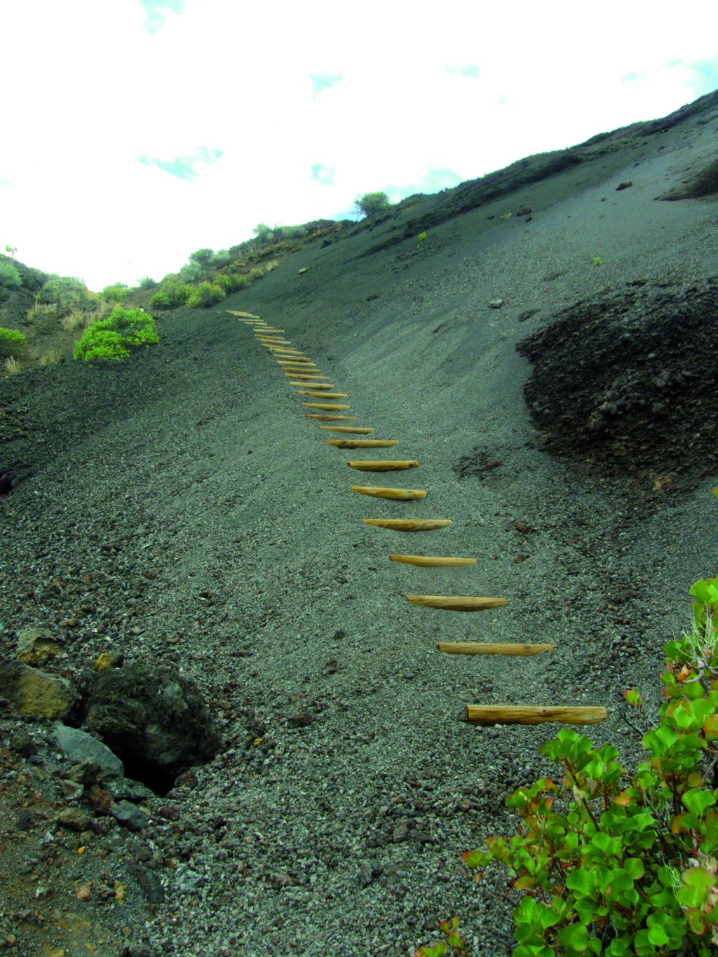 Peldaños de madera en el camino puestos para facilitar el paso por la ladera de grava volcánica