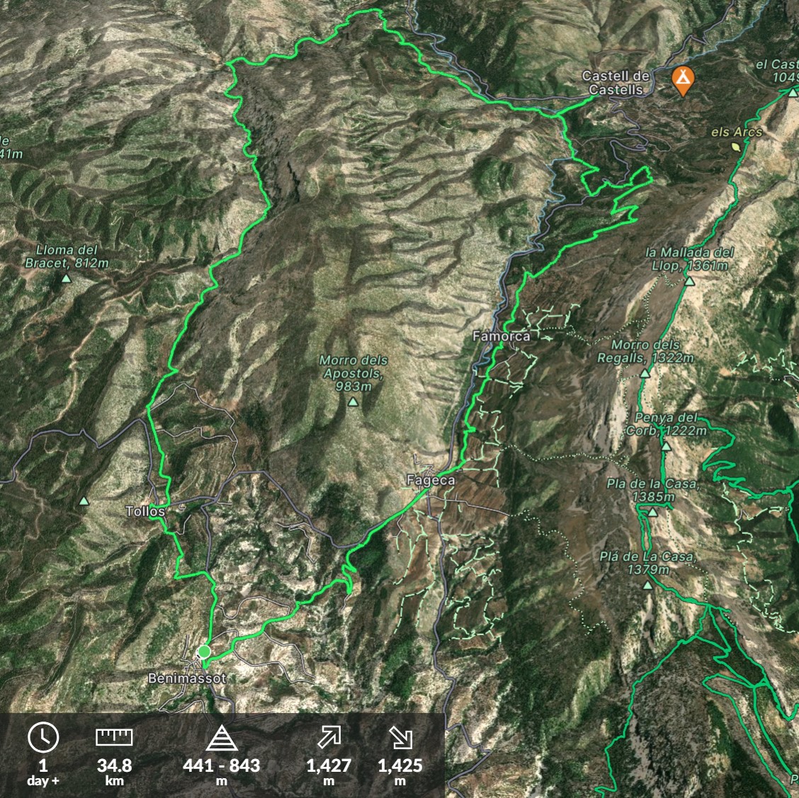 IBP Corriendo: 193 IBP Caminando: 107 IBP Bicicleta: 77 Desnivel de subida: 938 m Desnivel de bajada: 934 m Distancia Horizontal: 0,0 Km Altitud Final: 718 m Altitud Inicial: 721 … PR CV 168 Benimassot – Barranc de Malafí – Castell de Castells – Benimassot Mas...