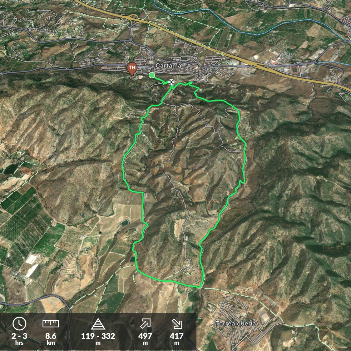 488 mtros. 450 mtros. 9 km. 130 mtros. 336 mtros. Alt.Ini:154 mtros. Alt.Fin:192 mtros. Des.Med:11% Duración:58 minutos (Estimado a 8.82 km/h) Dificultad:Media PR A 294 Circular Torrealquería Cartama Mas...