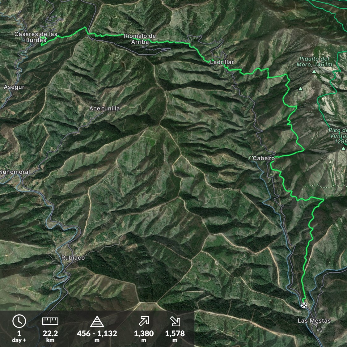 IBP Corriendo: 229 IBP Caminando: 106 IBP Bicicleta: 149 Desnivel de subida: 1082 m Desnivel de bajada: 1282 m Distancia Horizontal: 11,5 Km Altitud Final: 468 m Altitud Inicial: 654 … PR CC 212 Senda de Alfonso XIII (Casares de las Hurdes – Las Mestas) Mas...