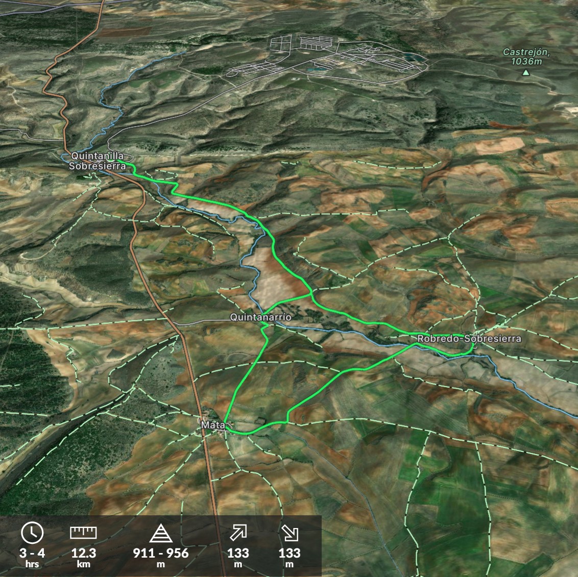 45 mtros. 47 mtros. 12 km. 923 mtros. 961 mtros. Alt.Ini:961 mtros. Alt.Fin:955 mtros. Des.Med:2% Dificultad:Fácil Duración:02 horas 47 minutos (Estimado a 4.42 km/h) Acceso:Quintanilla de Sobresierra Nota:Fin en :Quintanilla … PR BU 208 Sendero de Robredo, Mata y Quintanarrío Mas...