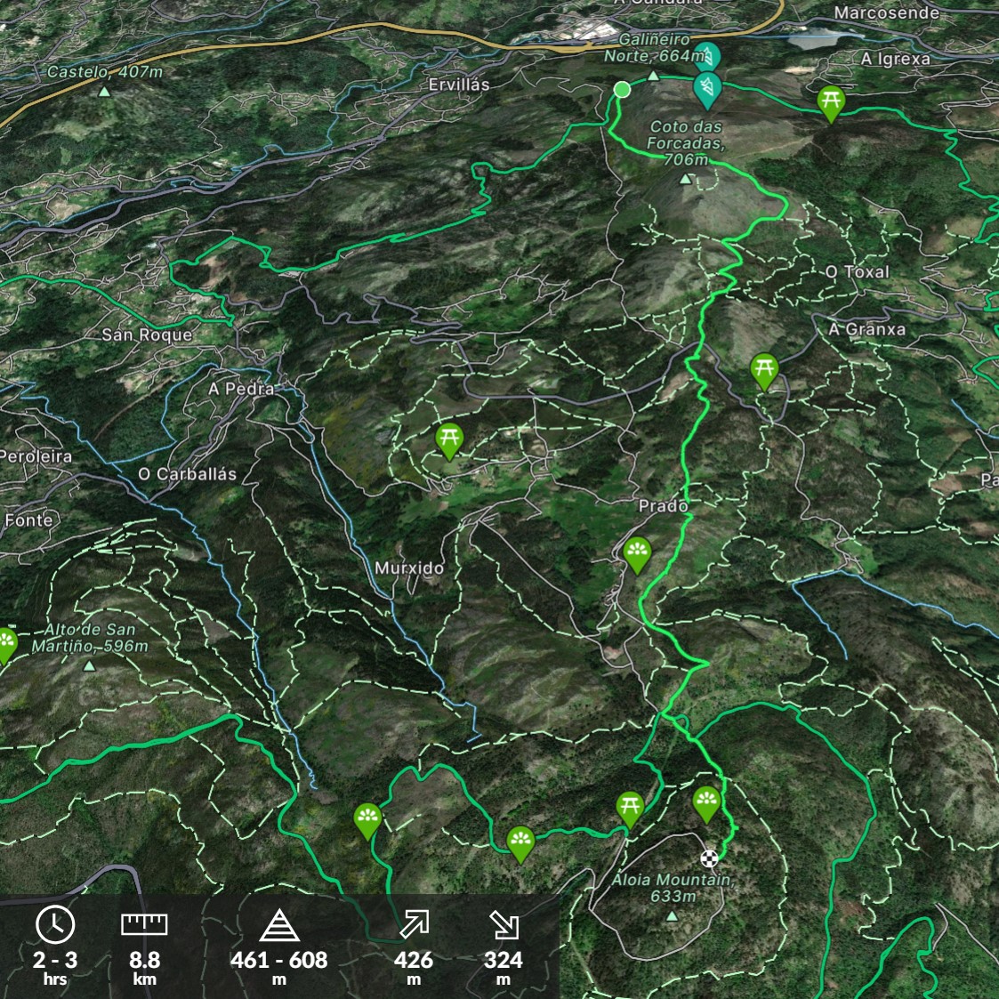 401 mtros. 302 mtros. 9 km. 460 mtros. 608 mtros. Alt.Ini:508 mtros. Alt.Fin:607 mtros. Des.Med:9% Dificultad:Fácil Duración:03 horas 08 minutos (Estimado a 2.80 km/h) Informacion:Bonito y fácil recorrido que nos … PR G 2 Monte Aloia Mas...